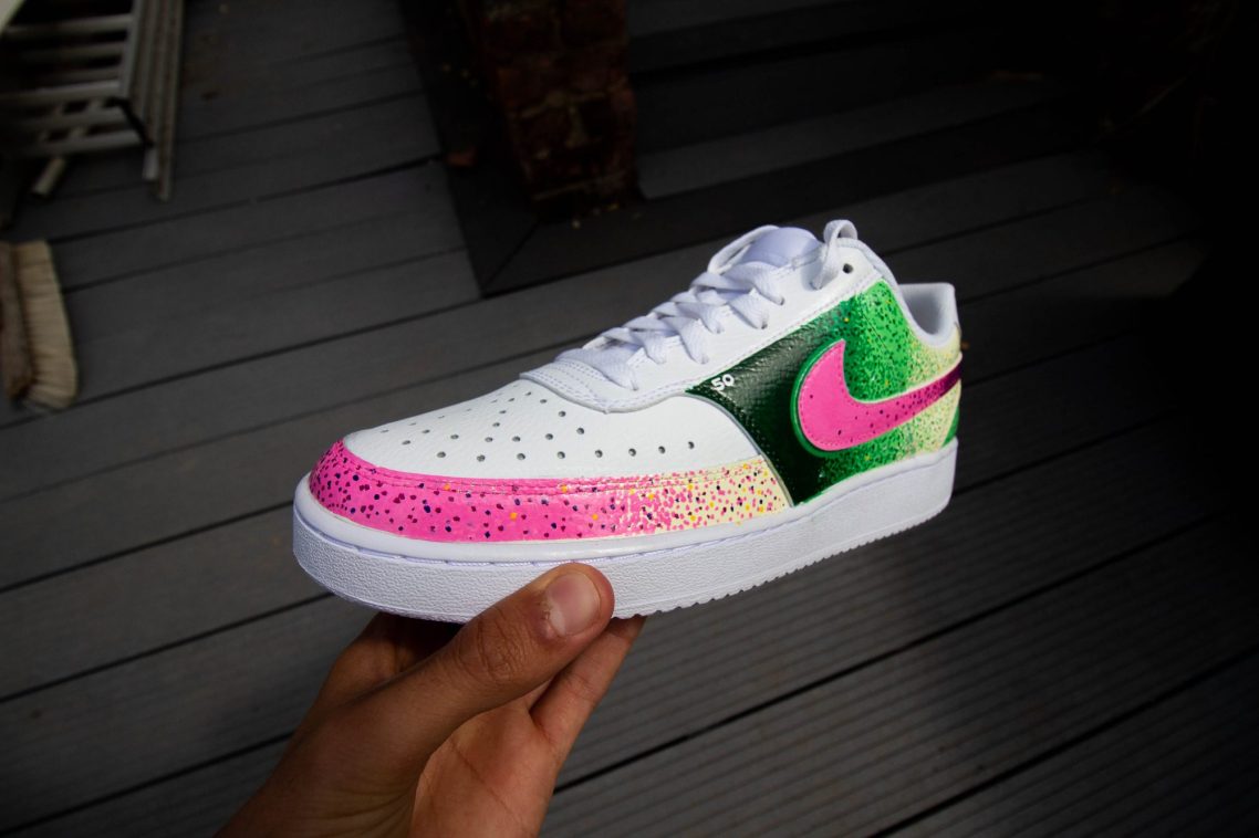 Crazy green and pink stipilling on a pair of Nike Court Vision's. 50th Bday present!